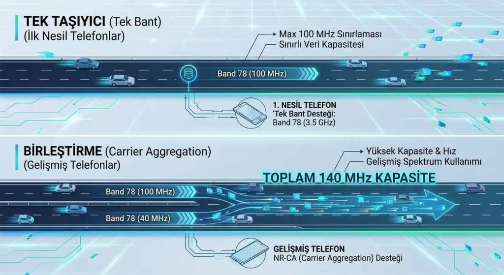 5G’de Gbps seviyelerini görmek sadece sinyal gücüyle değil, cihazınızın yeteneğiyle de ilgilidir. NR-CA (Carrier Aggregation) teknolojisi, birden fazla 5G bandını aynı anda kullanmanızı sağlar.