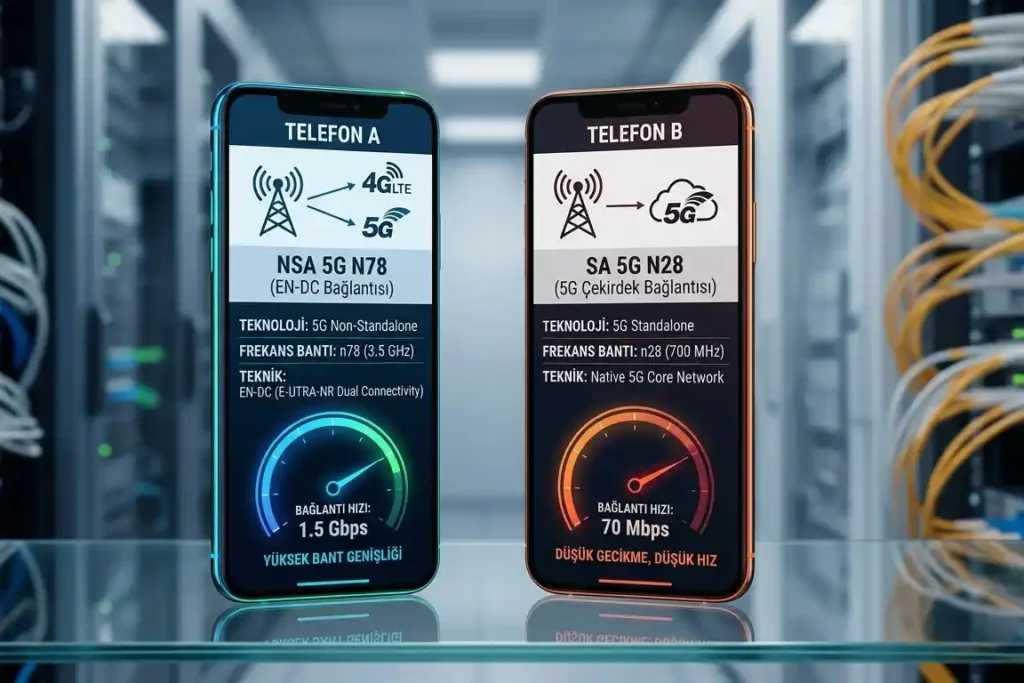 - Non-Standalone (NSA – Bağımsız Olmayan): Bu sistemde 5G, tek başına değil 4G altyapısından destek alarak çalışır. EN-DC teknolojisi sayesinde cihazınız aynı anda hem 4G hem de 5G sinyallerine bağlı kalır. Bu durum, VoNR (5G üzerinden ses) desteği olmayan cihazların bile bağlantı kopmadan arama yapabilmesini sağlar. İndirme (download) hızları açısından SA’dan geri kalmaz; bu nedenle NSA’ya “sahte 5G” yakıştırması yapmak teknik olarak yanlıştır.