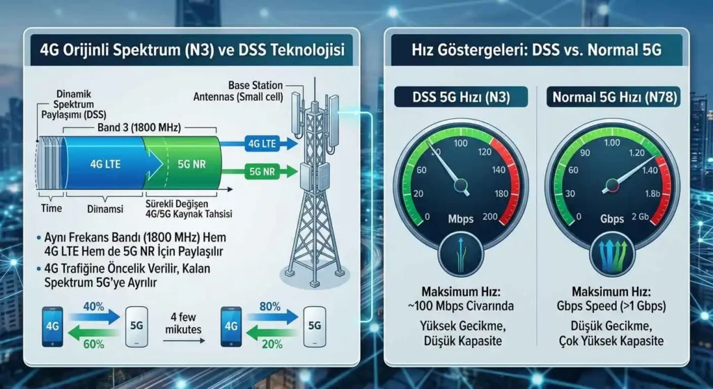 - Band 3 (1800 MHz): Operatörlerin elindeki mevcut 4G kapasitesini DSS (Dinamik Spektrum Paylaşımı) ile hem 4G hem 5G için ortak kullanmasıdır. Donanım yükseltmesi gerektirmediği için yaygınlaşması kolaydır ancak hızlar genellikle mevcut 4.5G seviyelerinde kalır.